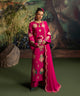 A luscious ruby red silk canvas serves as a base for meticulously designed aari embroidered motifs in pink, coral and green. The intricately hand-embellished shirt is adorned with pearls and gold sequins. It is paired with red flared trousers.