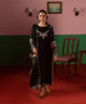 A navy blue silk base serves as a canvas to a modern long-shirt silhouette featuring silver and sky blue embroidered neckline along with swirl-style embroidery on front and sleeves. It is paired with embroidered flared trousers and an organza dupatta, perfectly blending and sophistication and festive charm.
