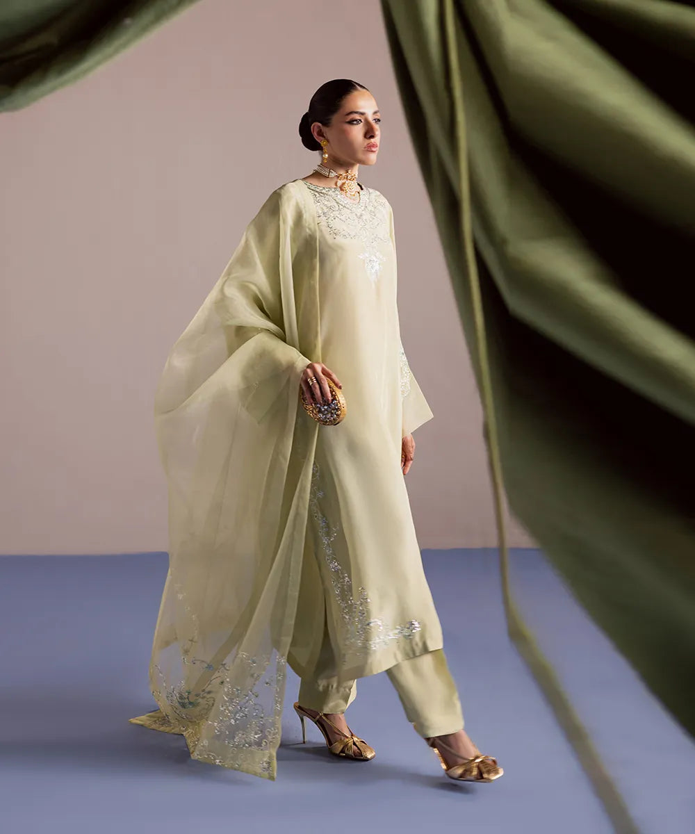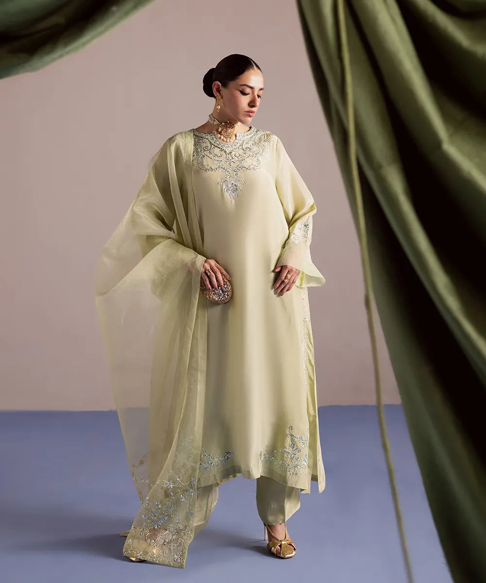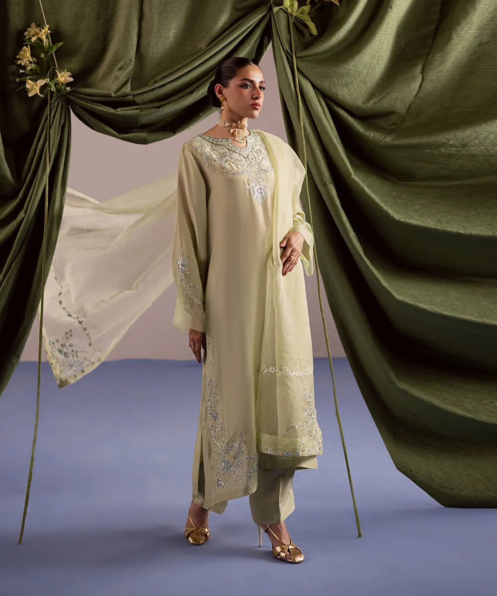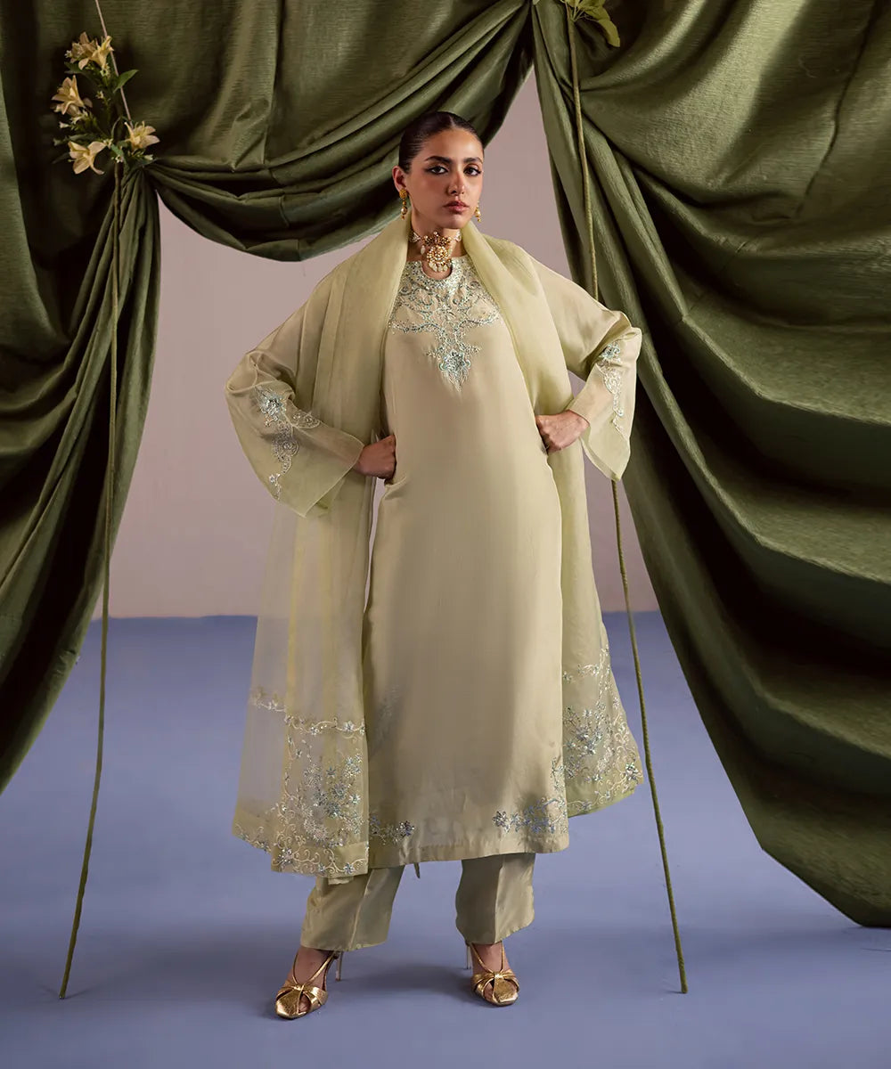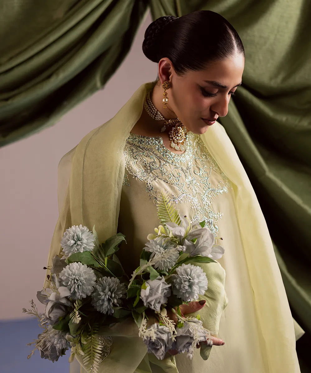 A luscious silk shirt in pistachio features meticulously designed intricate embroidery in ice blue and ivory. It is adorned with silver sequins that adds sparkle to the ensemble. The look is completed with an organza dupatta and matching trousers.