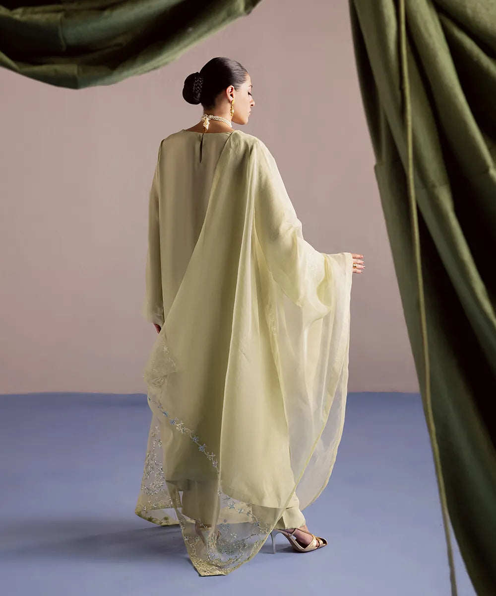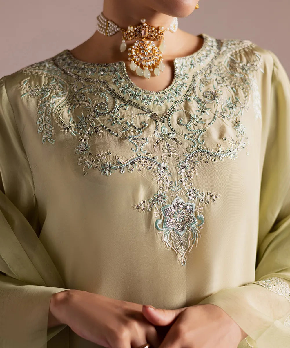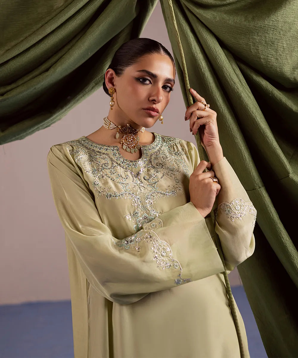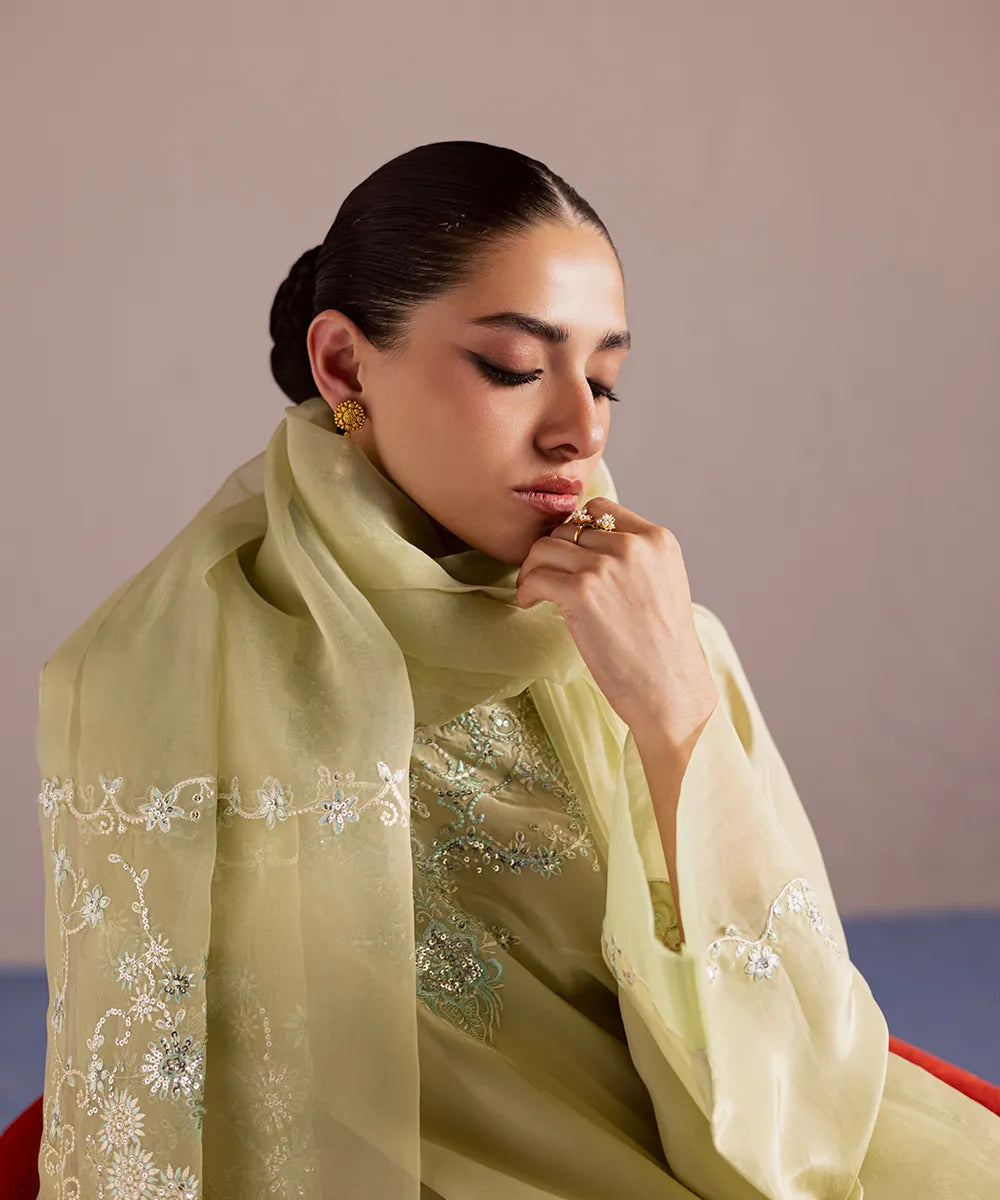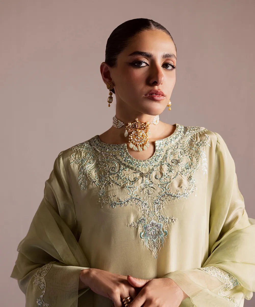 A luscious silk shirt in pistachio features meticulously designed intricate embroidery in ice blue and ivory. It is adorned with silver sequins that adds sparkle to the ensemble. The look is completed with an organza dupatta and matching trousers.