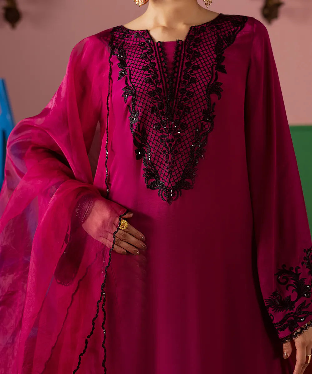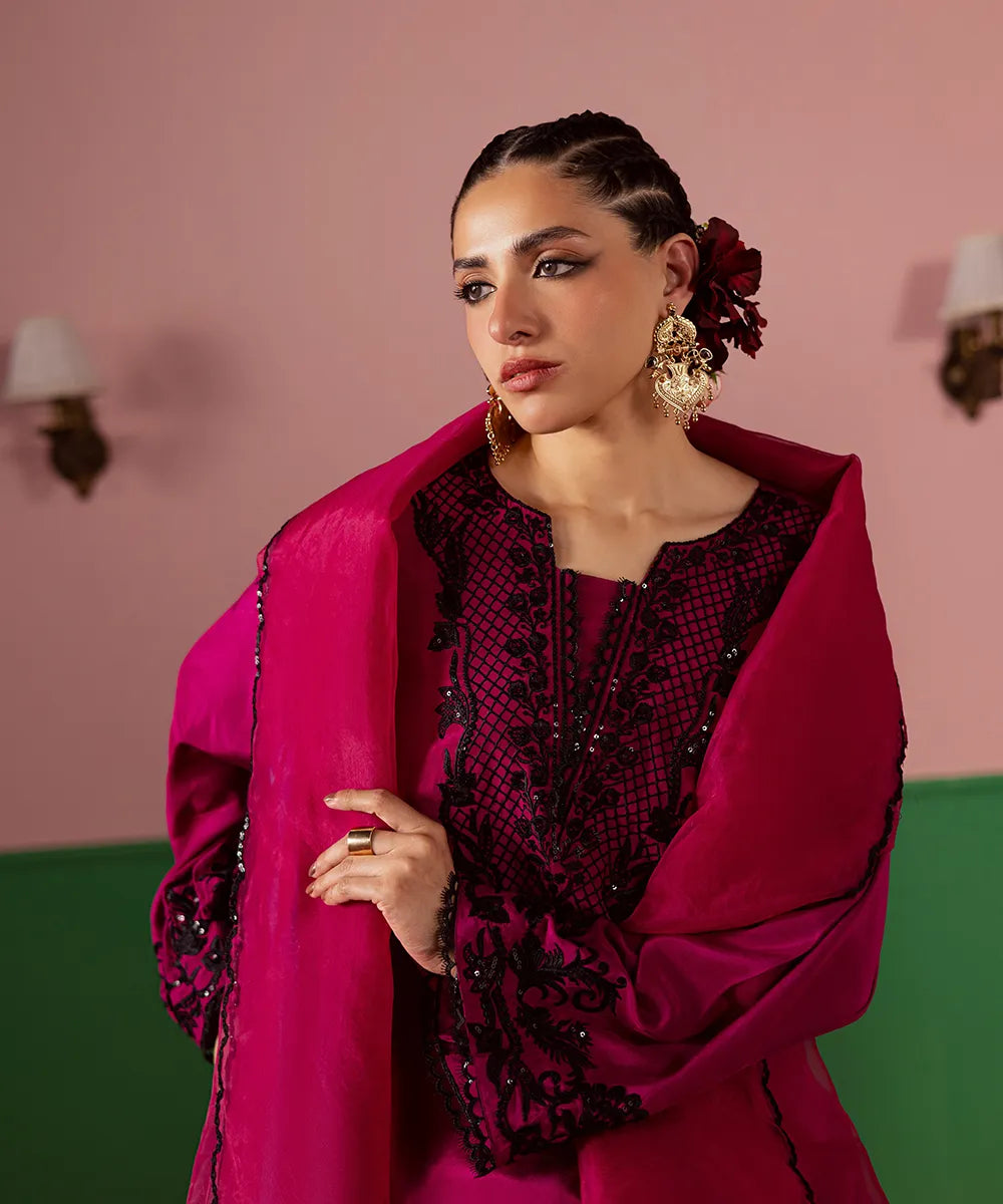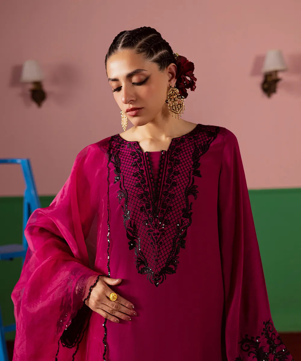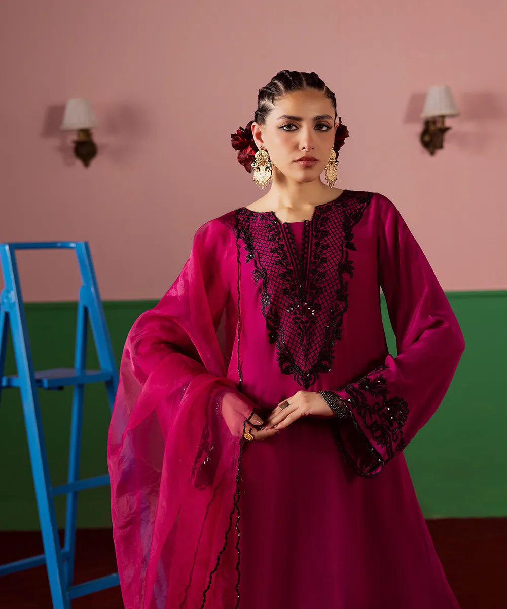 A magenta silk serves as a canvas to a modern long-shirt silhouette featuring intricate black embroidery on the neckline. It is paired with embroidered flared trousers and an organza dupatta, perfectly blending sophistication and festive charm.