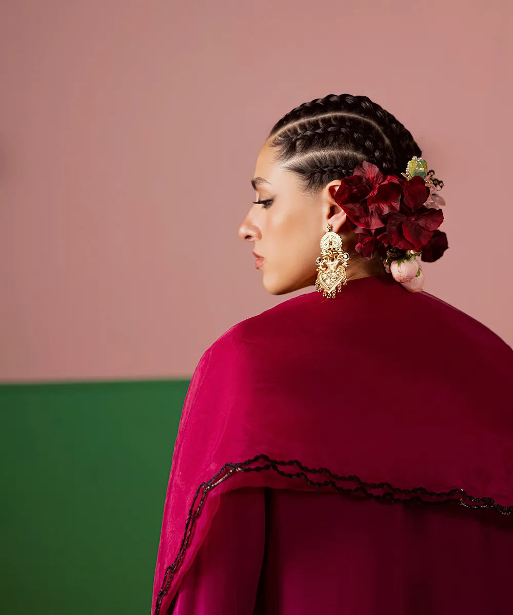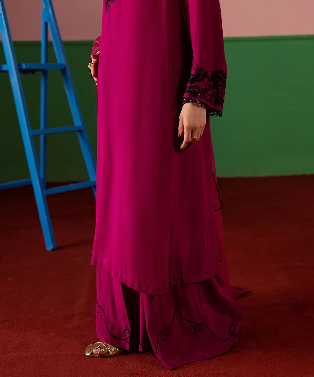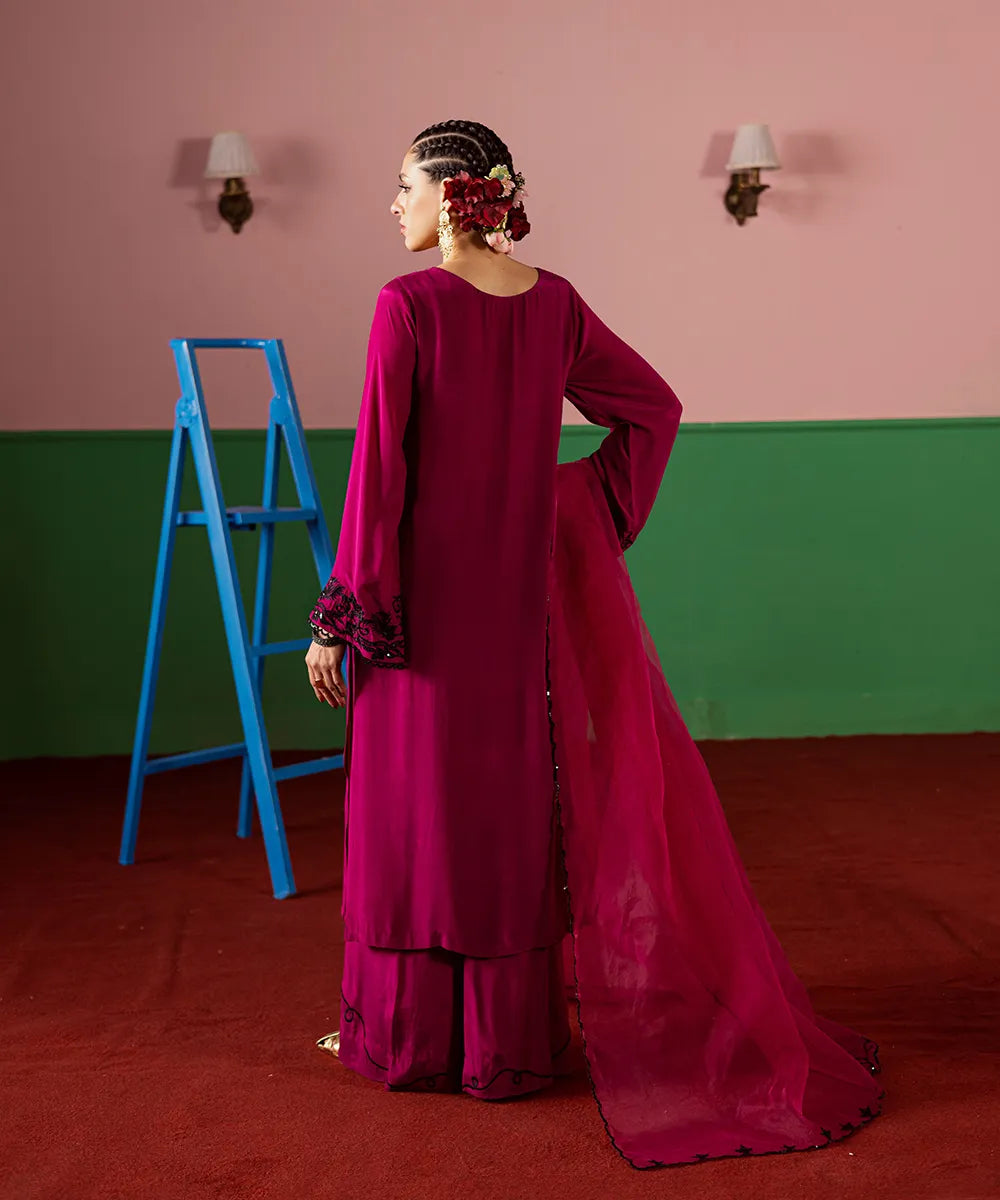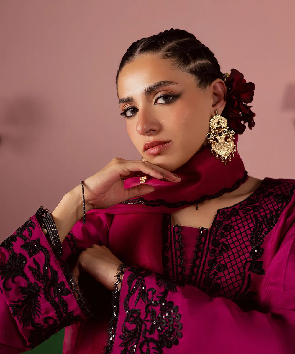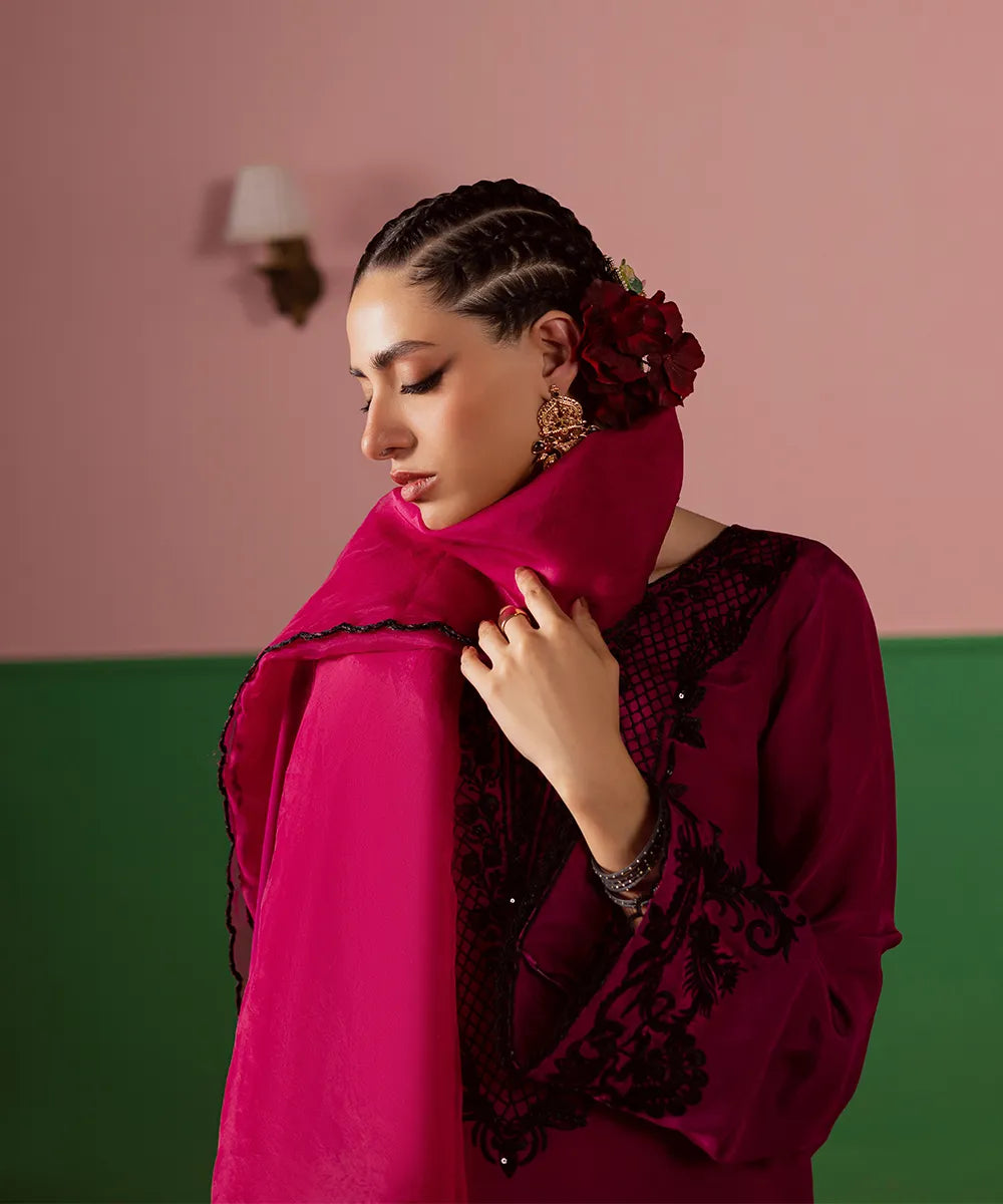A magenta silk serves as a canvas to a modern long-shirt silhouette featuring intricate black embroidery on the neckline. It is paired with embroidered flared trousers and an organza dupatta, perfectly blending sophistication and festive charm.