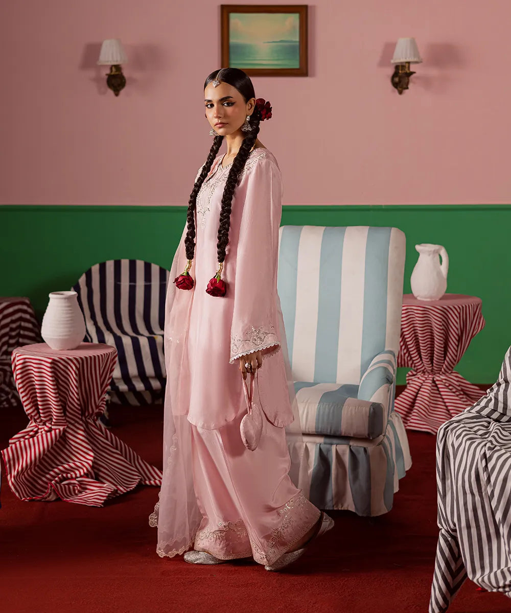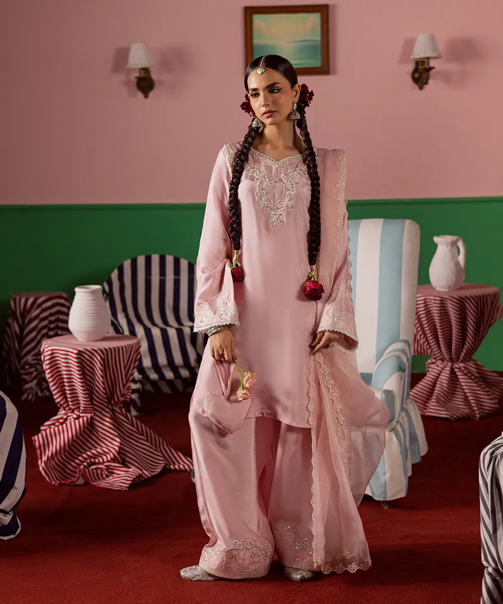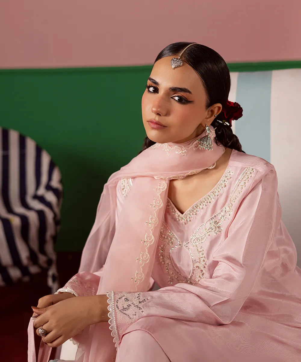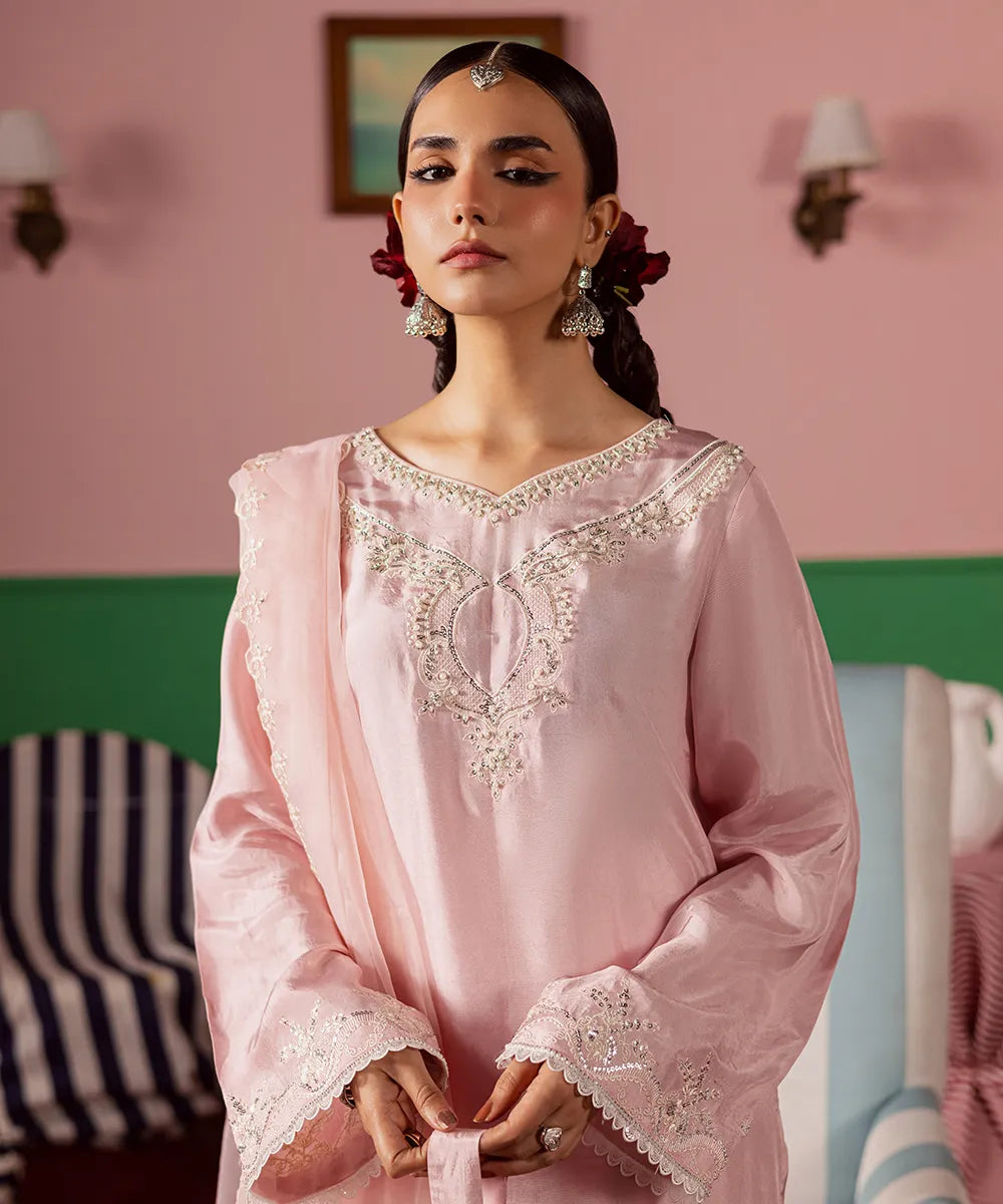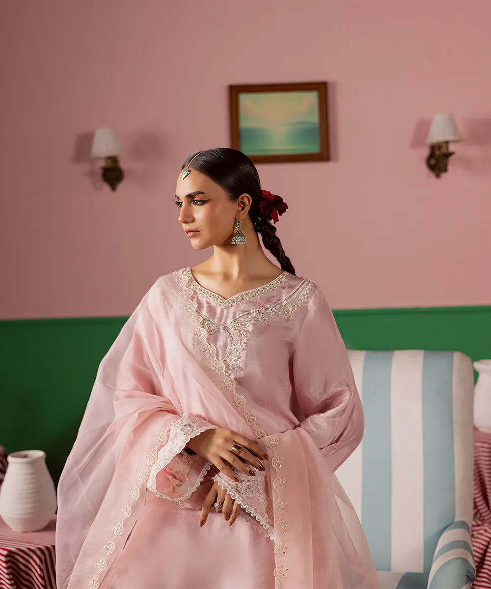 Exquisite craftsmanship adorns this powder-pink silk shirt, featuring intricate ivory embroidery embellished with pearls and sequins. The look is completed with an organza dupatta and matching farshi shalwar with embroidery.