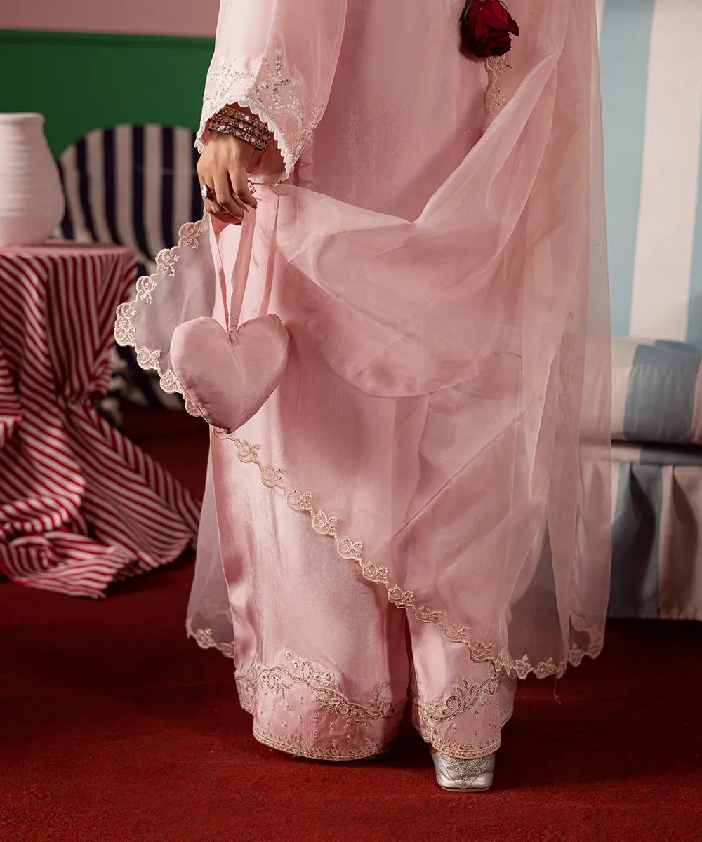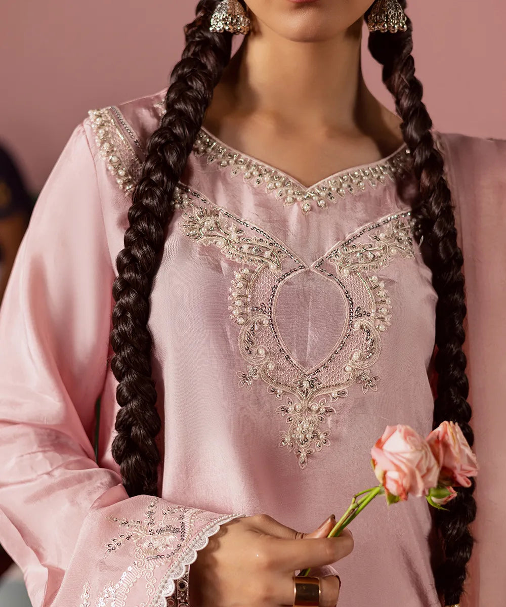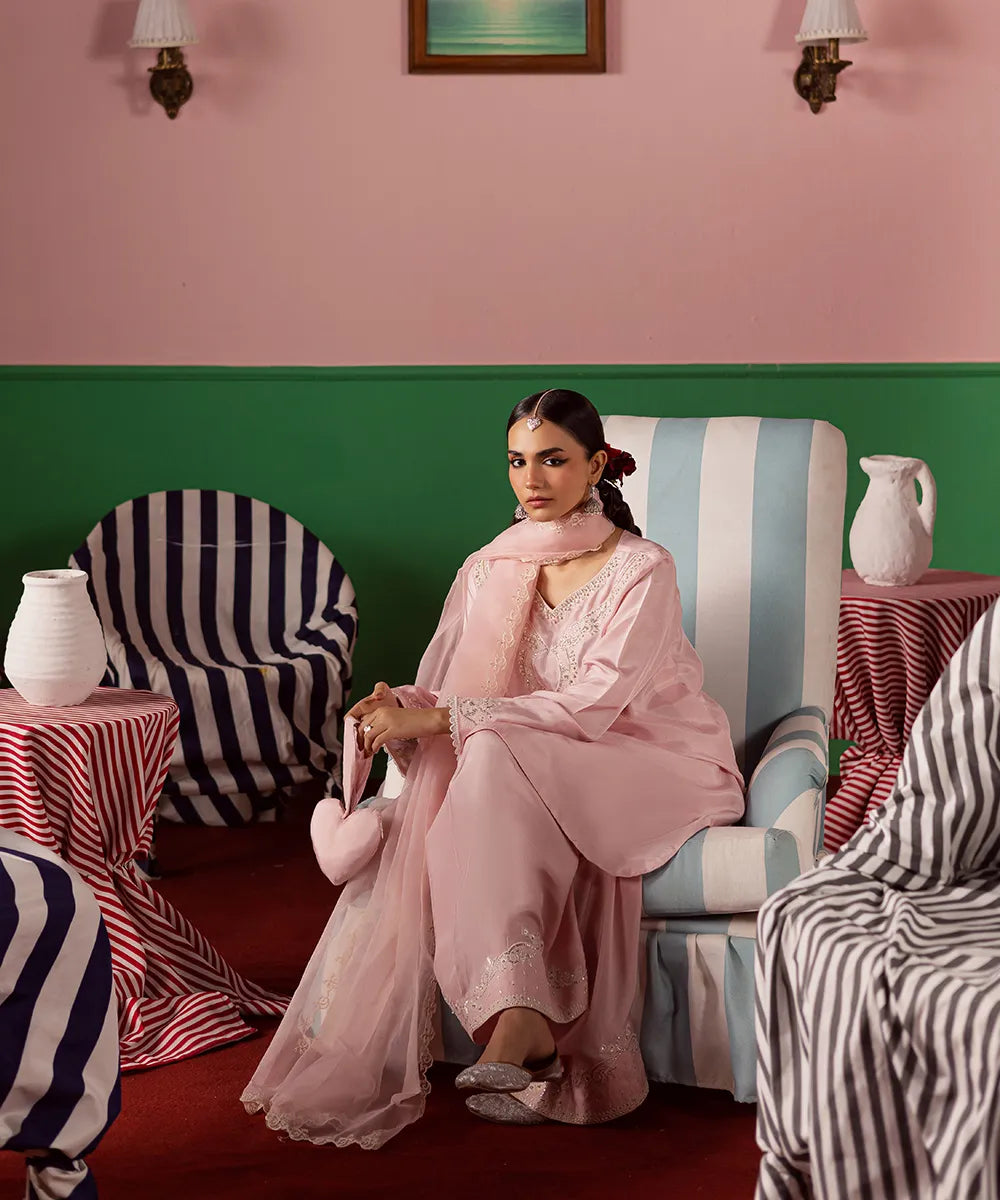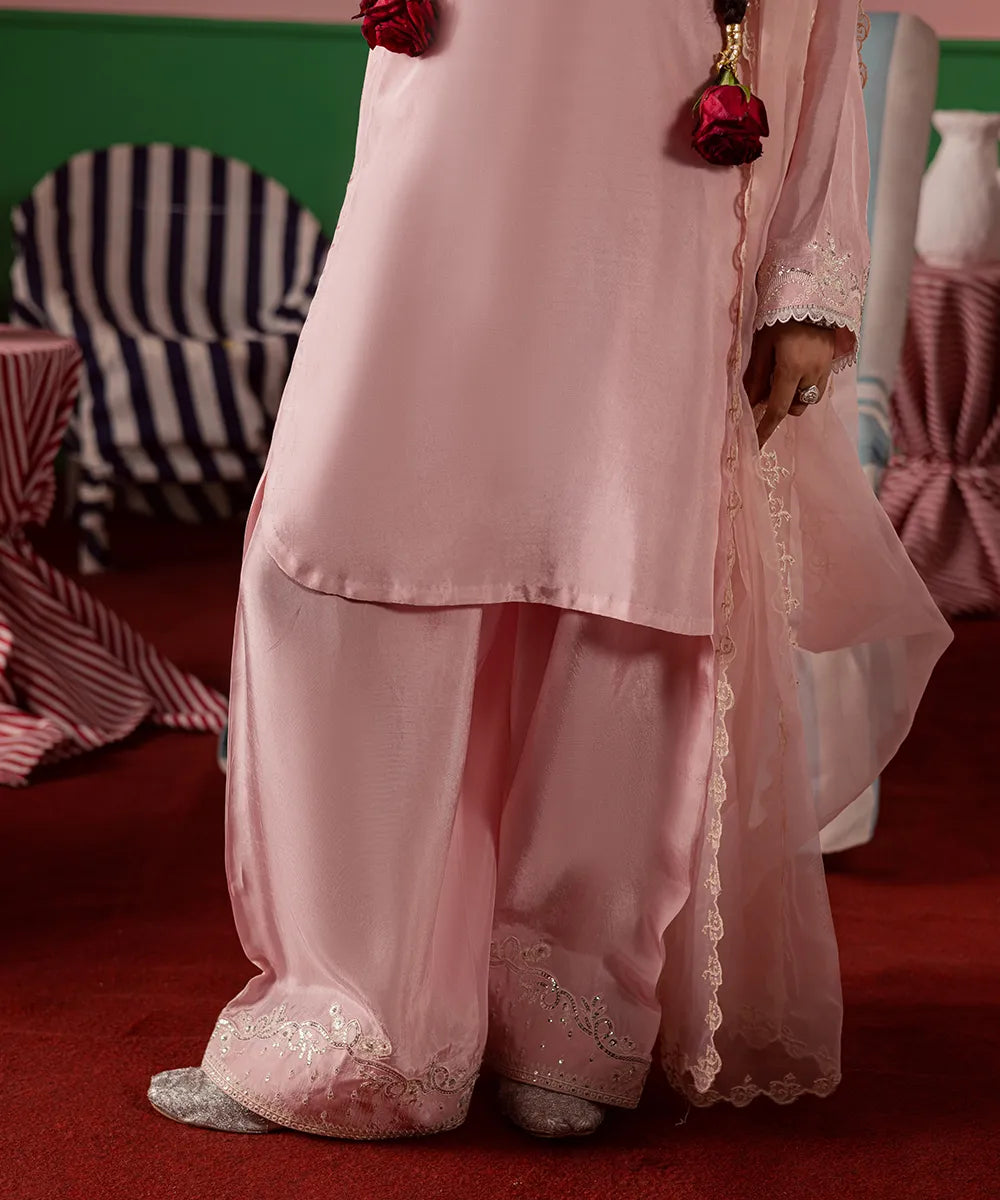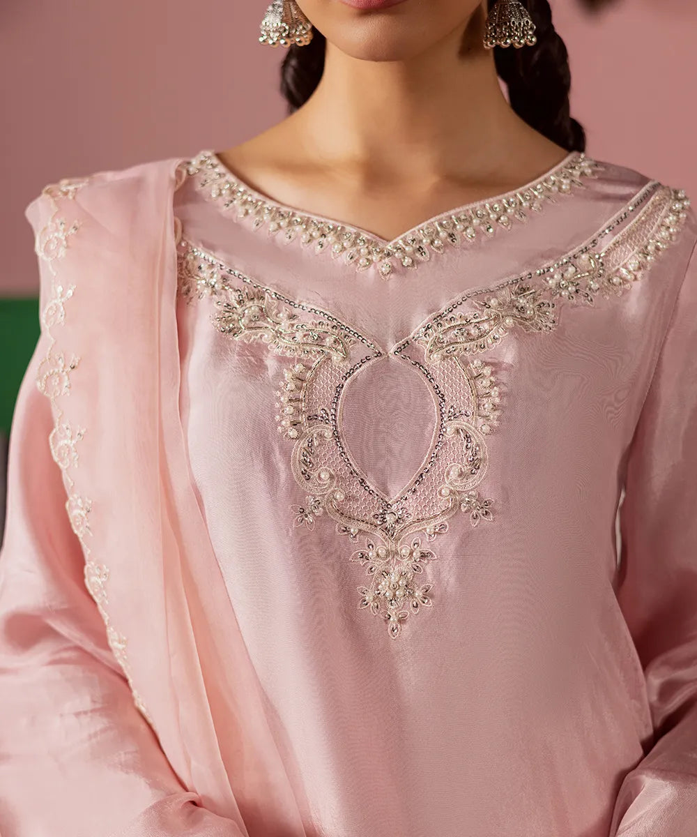 Exquisite craftsmanship adorns this powder-pink silk shirt, featuring intricate ivory embroidery embellished with pearls and sequins. The look is completed with an organza dupatta and matching farshi shalwar with embroidery.
