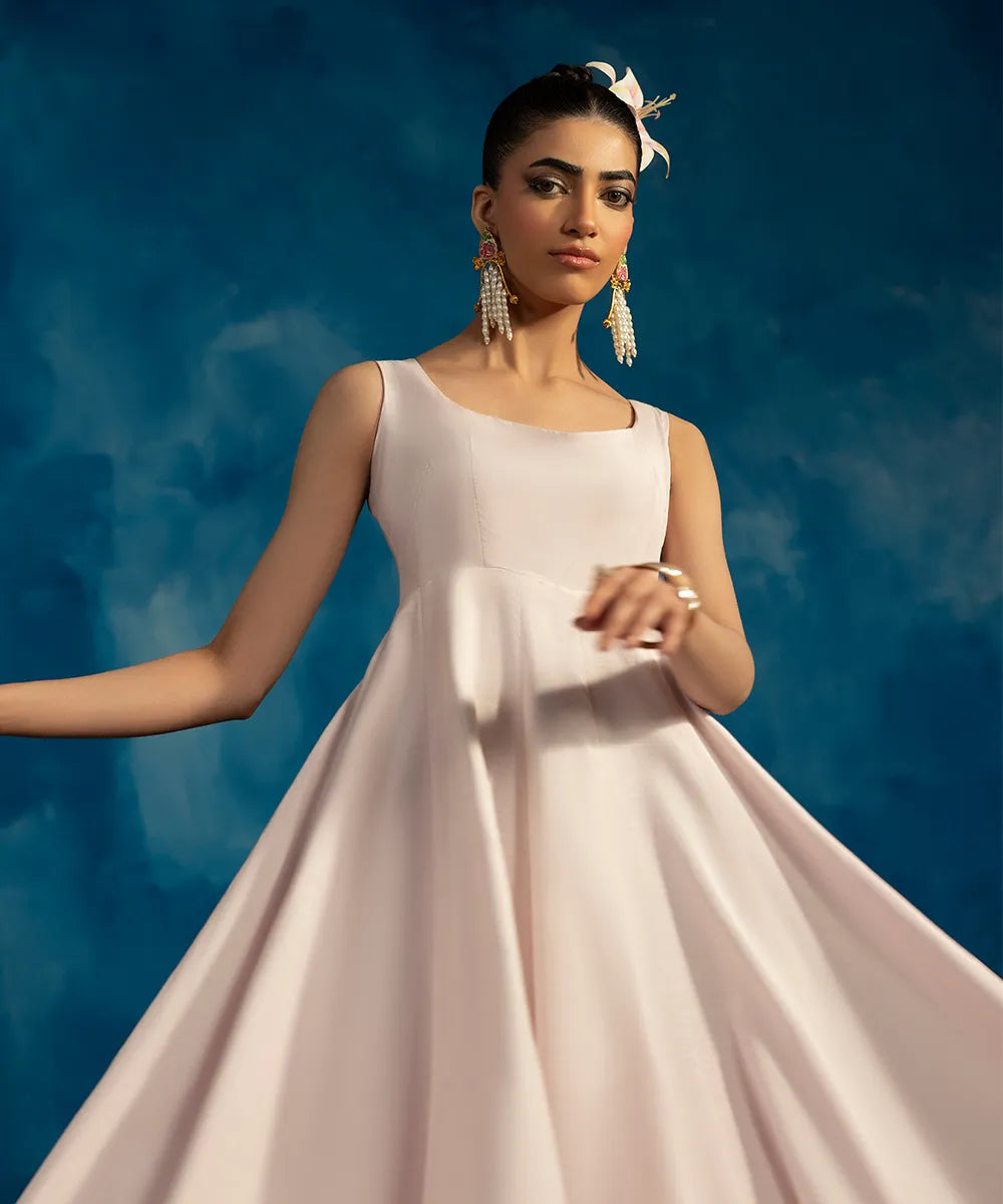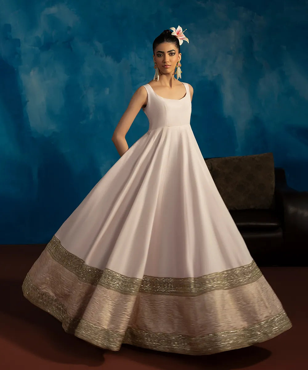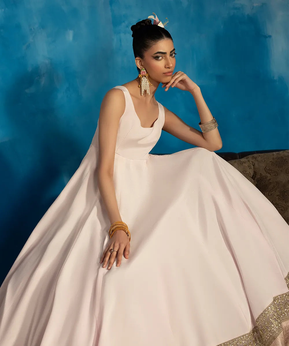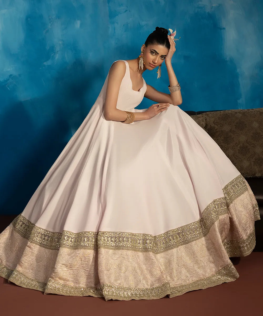 A baby pink pishwas in raw silk has a round neckline and a jamawar border with gold embroidery and sequins work.