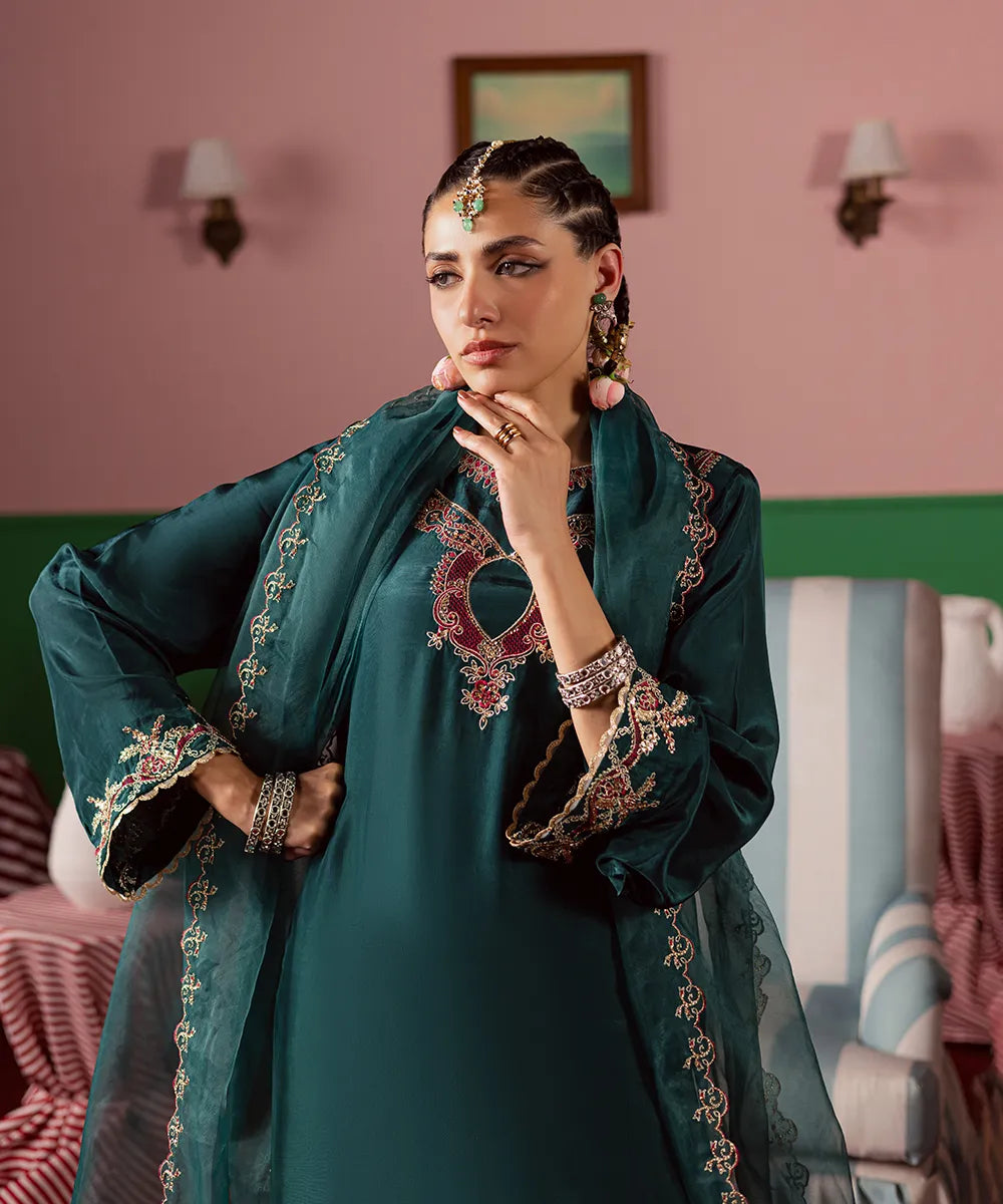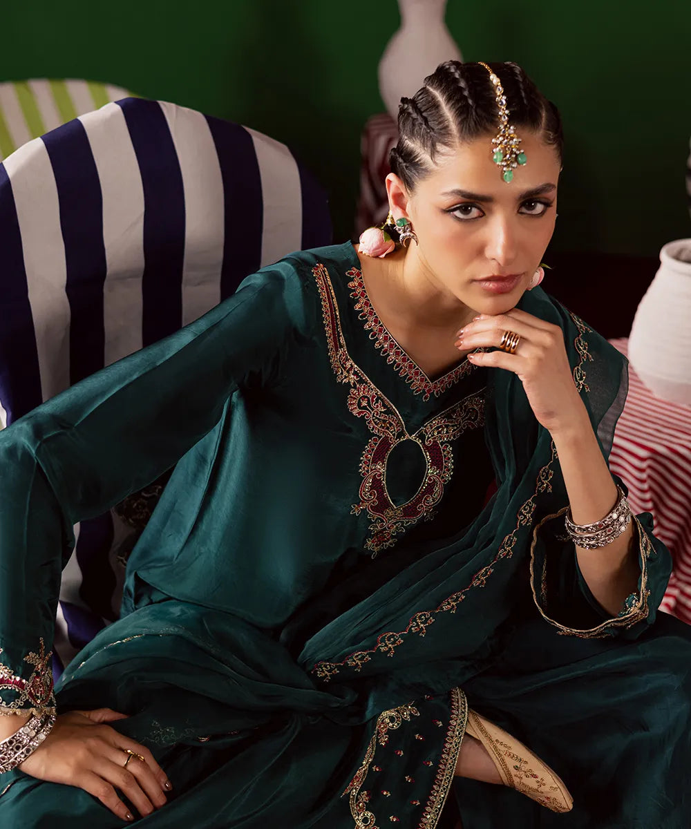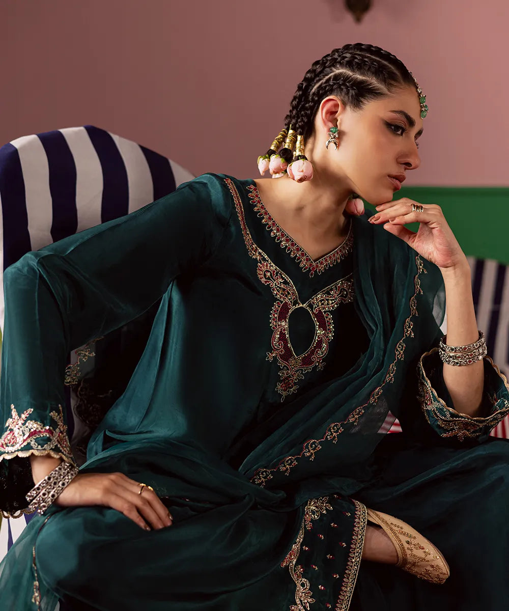 Exquisite craftsmanship adorns this bottle green silk shirt, featuring intricate fuchsia pink and gold embroidery embellished with pearls and sequins. The look is completed with an organza dupatta and matching farshi shalwar.