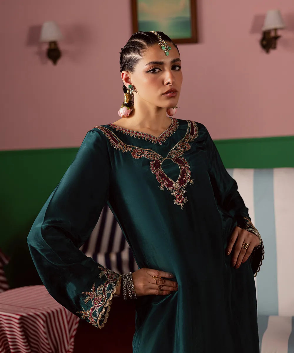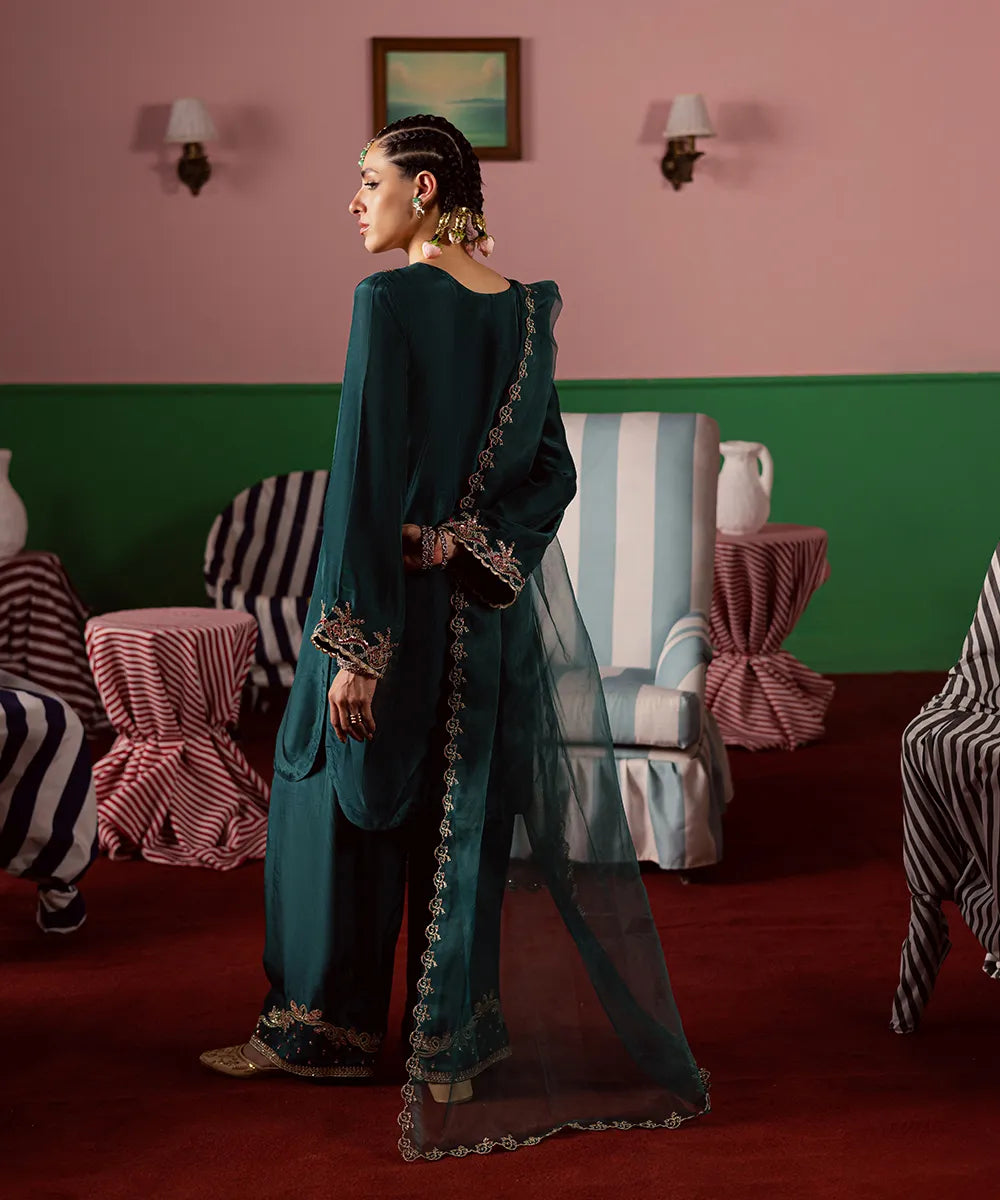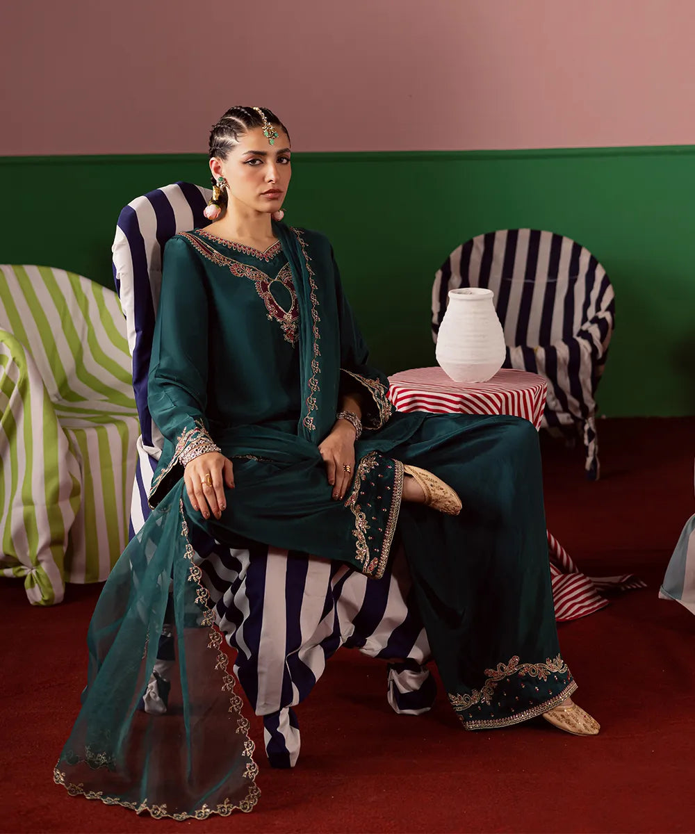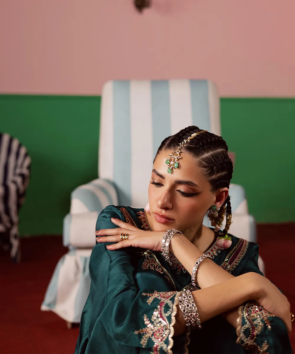 Exquisite craftsmanship adorns this bottle green silk shirt, featuring intricate fuchsia pink and gold embroidery embellished with pearls and sequins. The look is completed with an organza dupatta and matching farshi shalwar.
