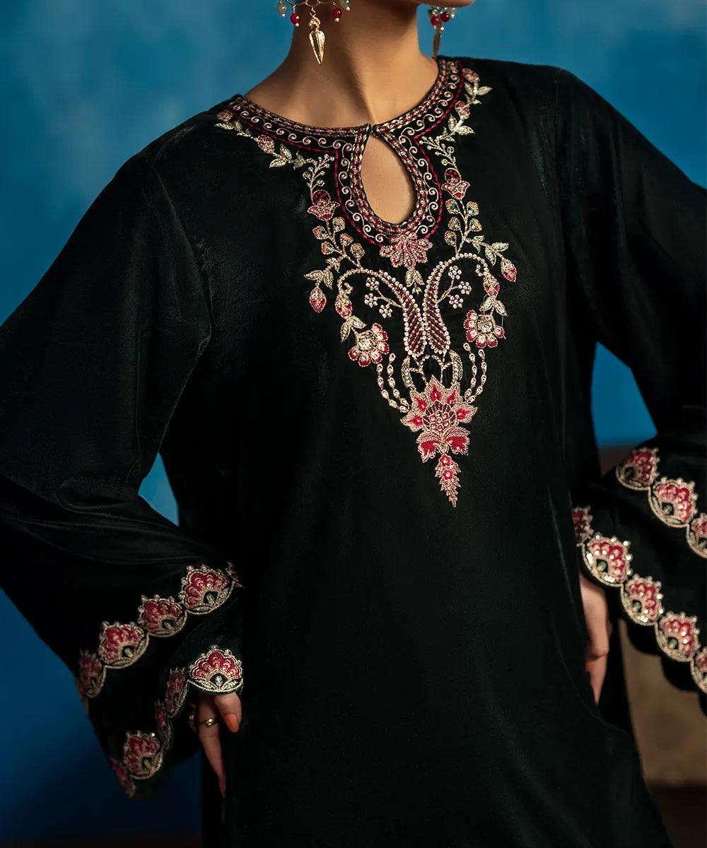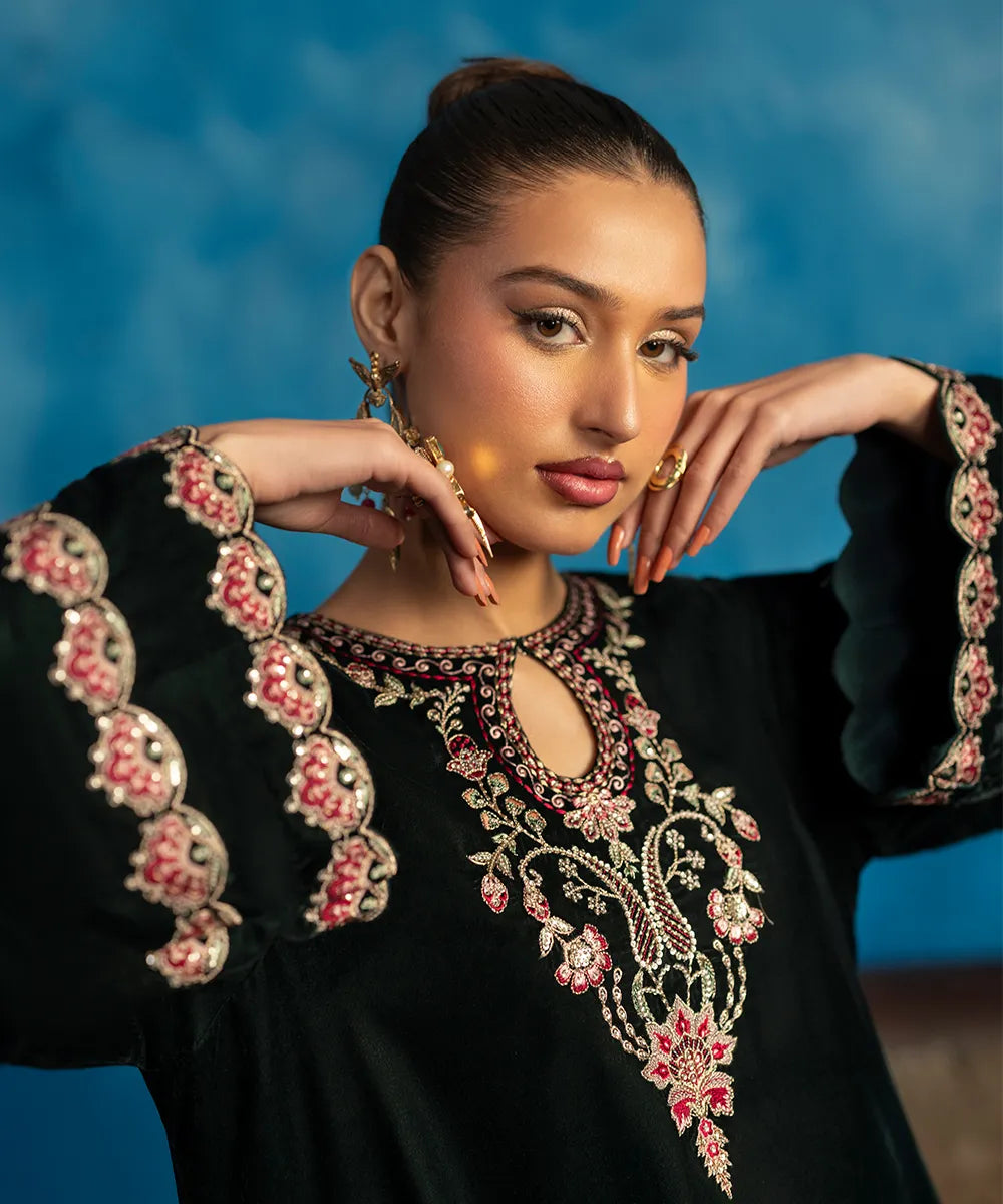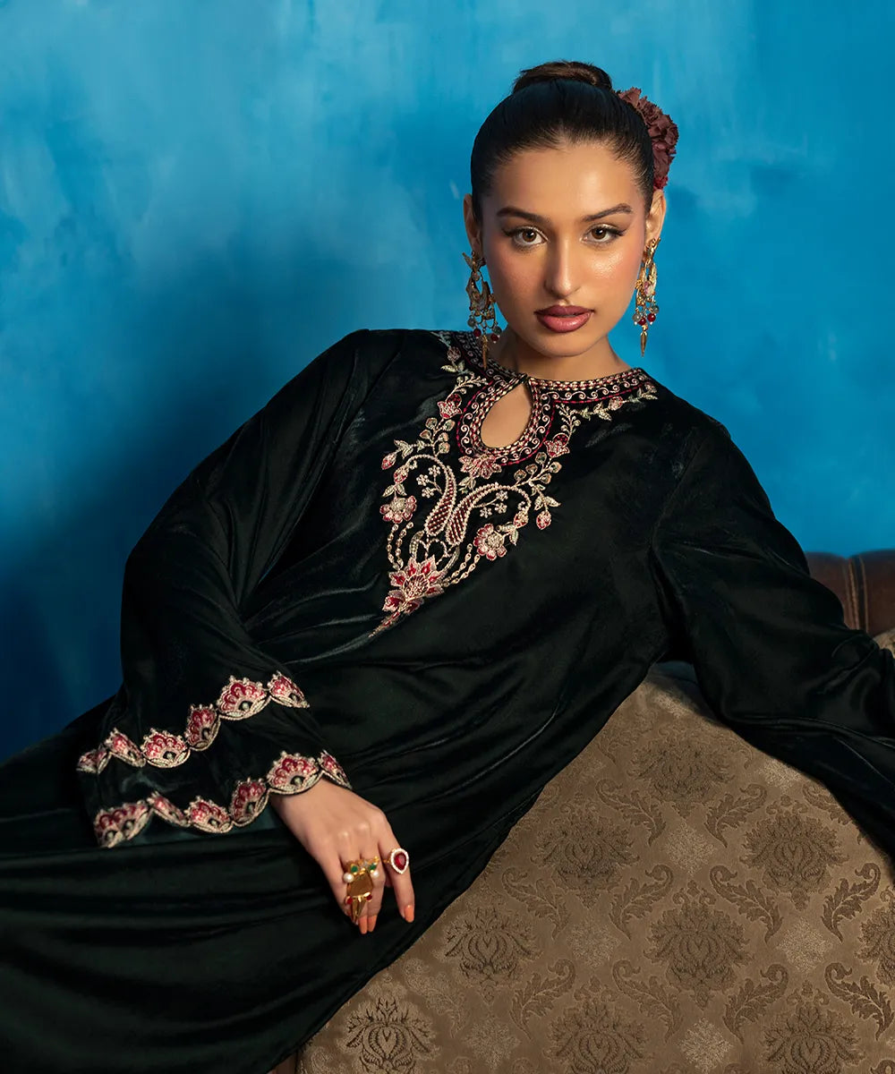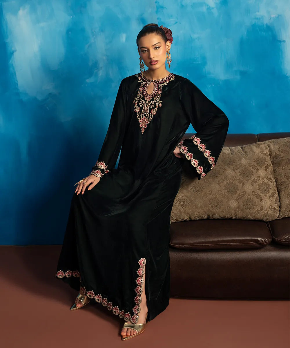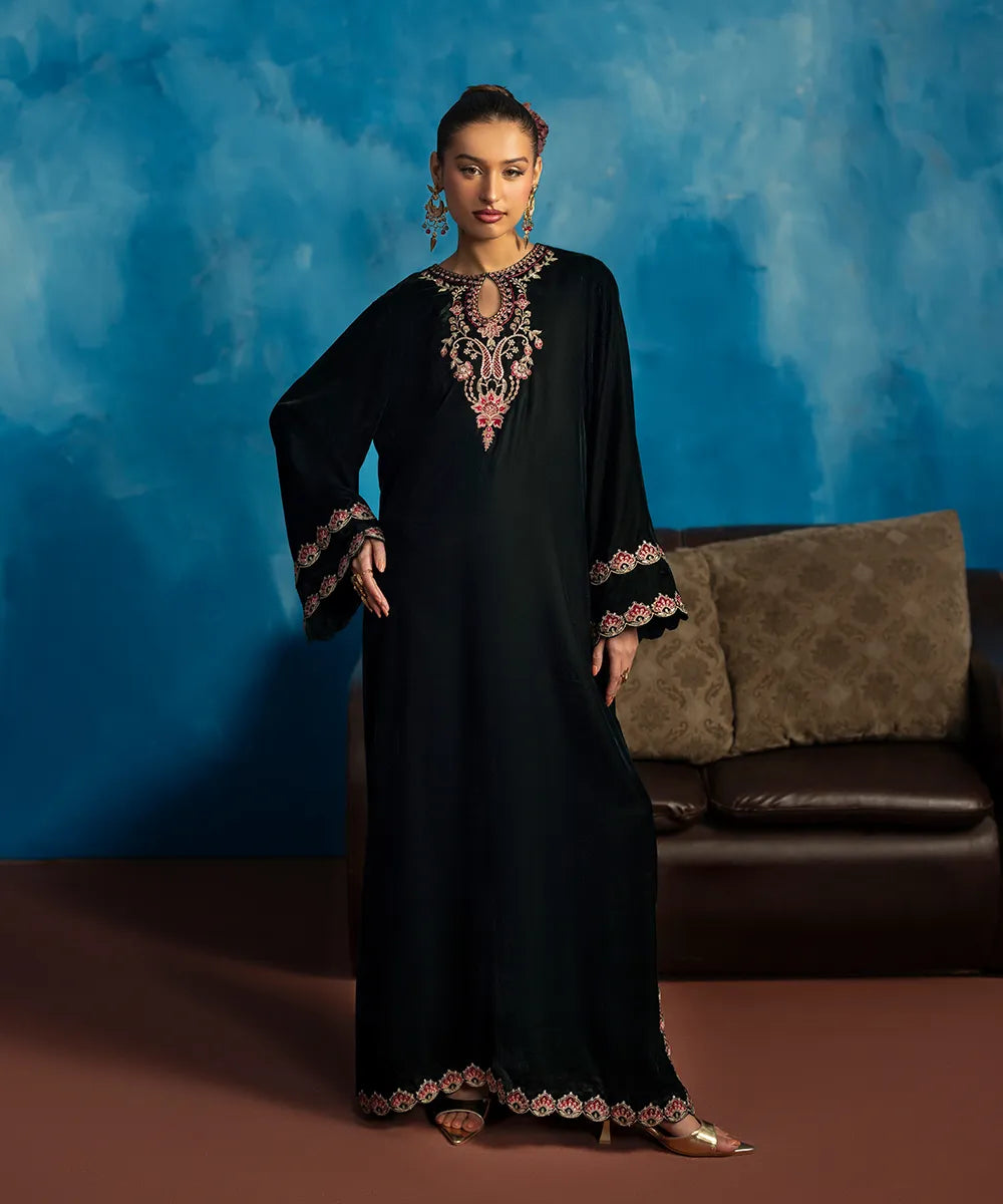 Embrace the beauty of this stunning bottle green kaftan crafted in luxury velvet with a heavenly gorgeous neckline and hem featuring florals blooming all over, meticulously woven like a poem in multi-colored resham threads.