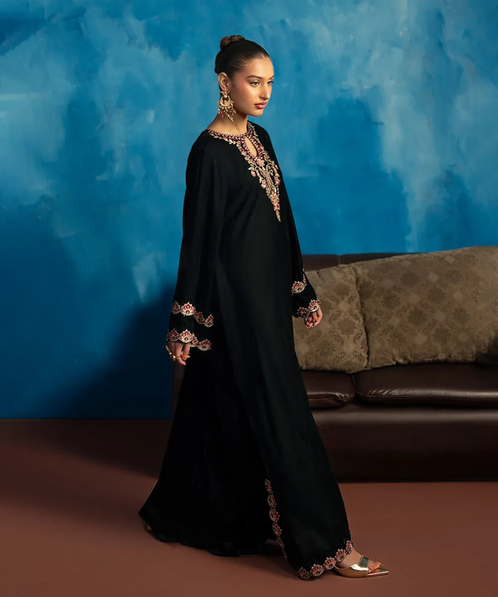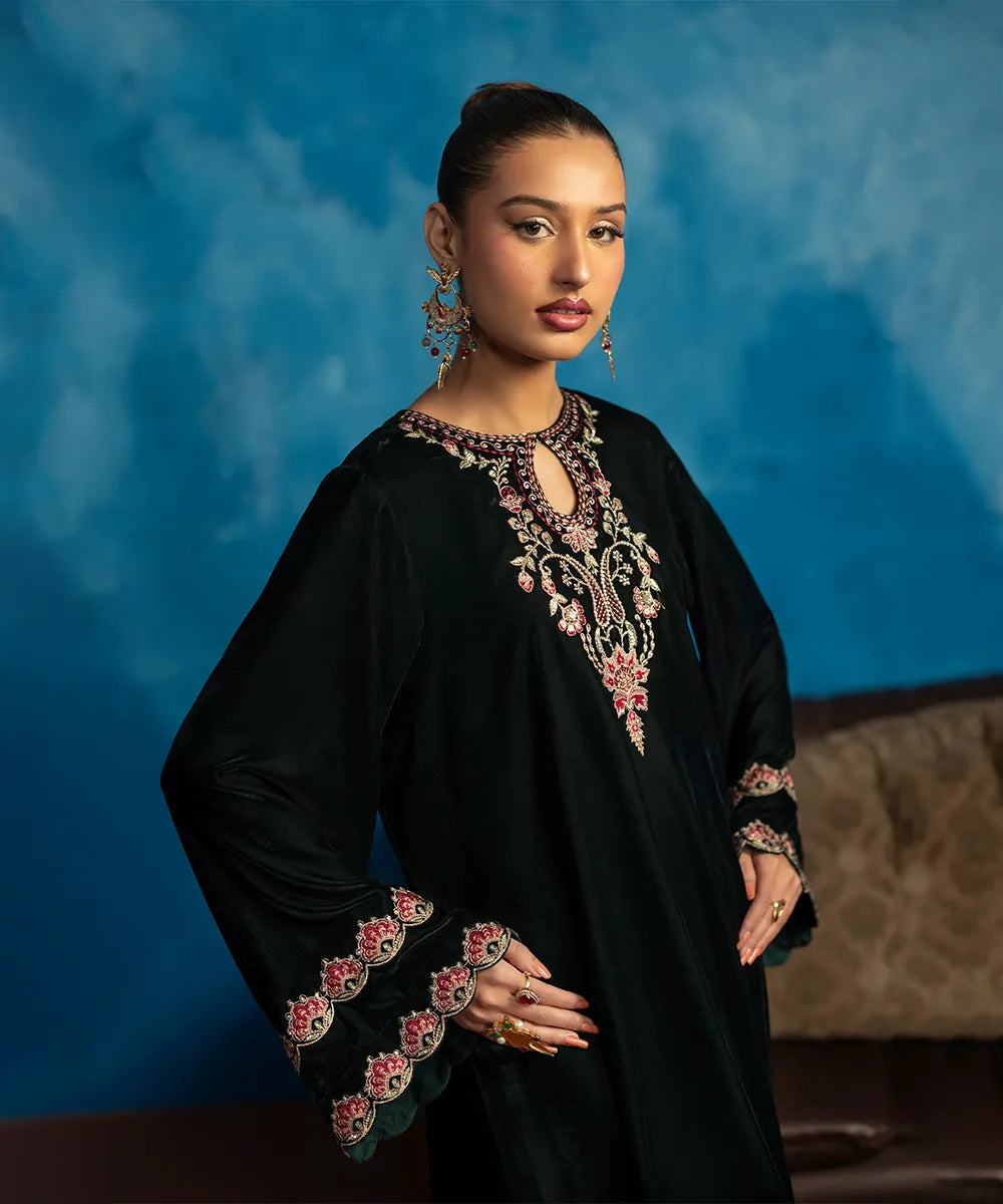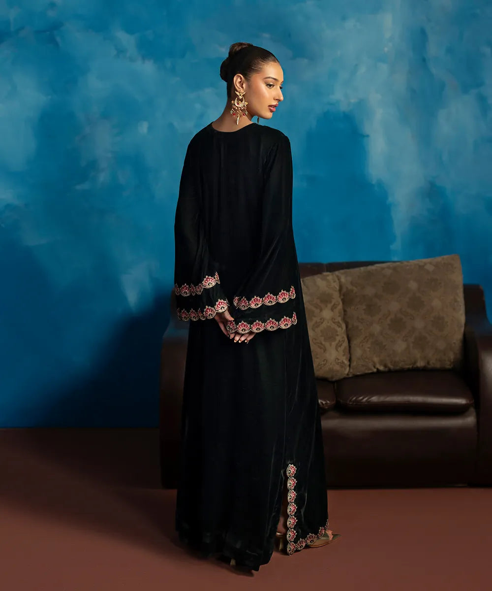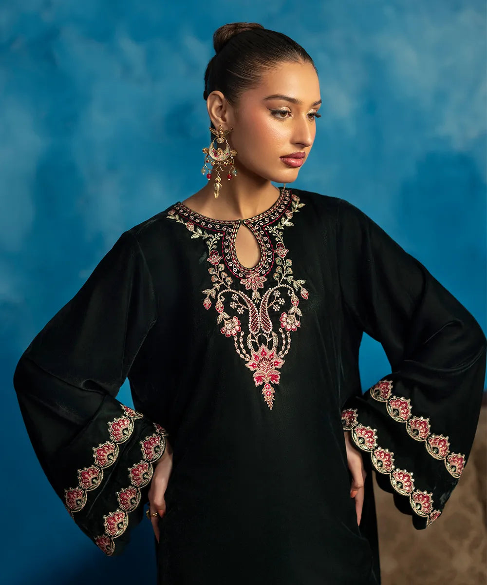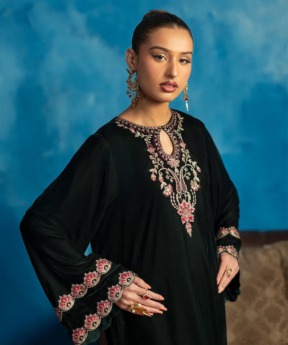 Embrace the beauty of this stunning bottle green kaftan crafted in luxury velvet with a heavenly gorgeous neckline and hem featuring florals blooming all over, meticulously woven like a poem in multi-colored resham threads.